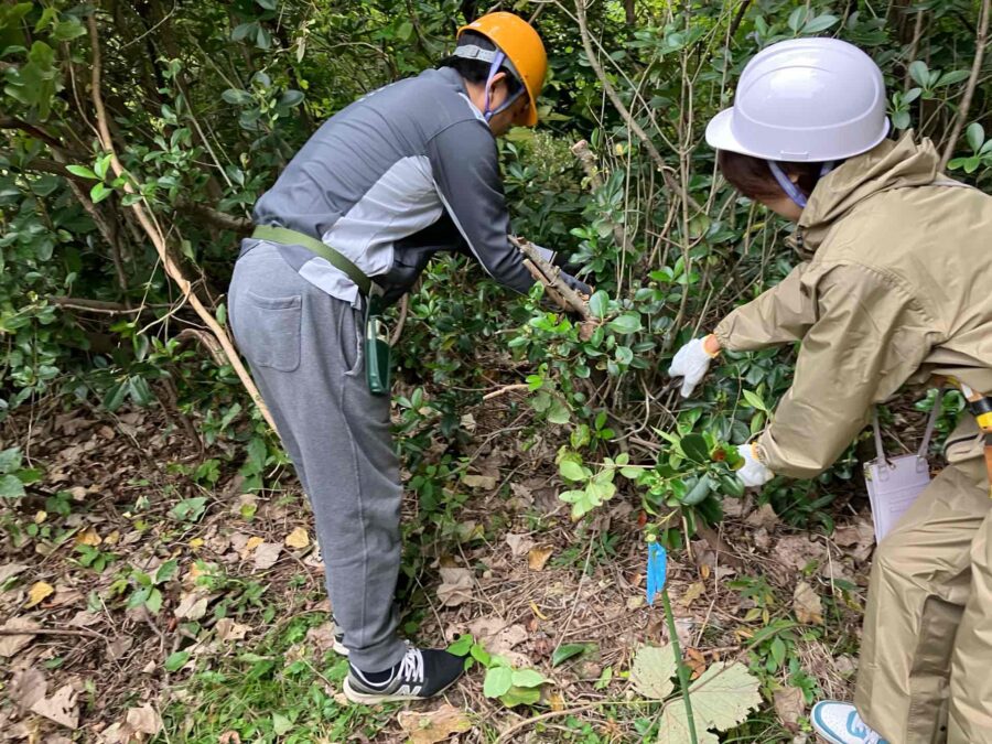 昨年度も同様のエリアの外来樹を伐採しましたが、まだまだ木々は生い茂り、ツルもびっしり! 参加者一丸となってノコギリを握ります。