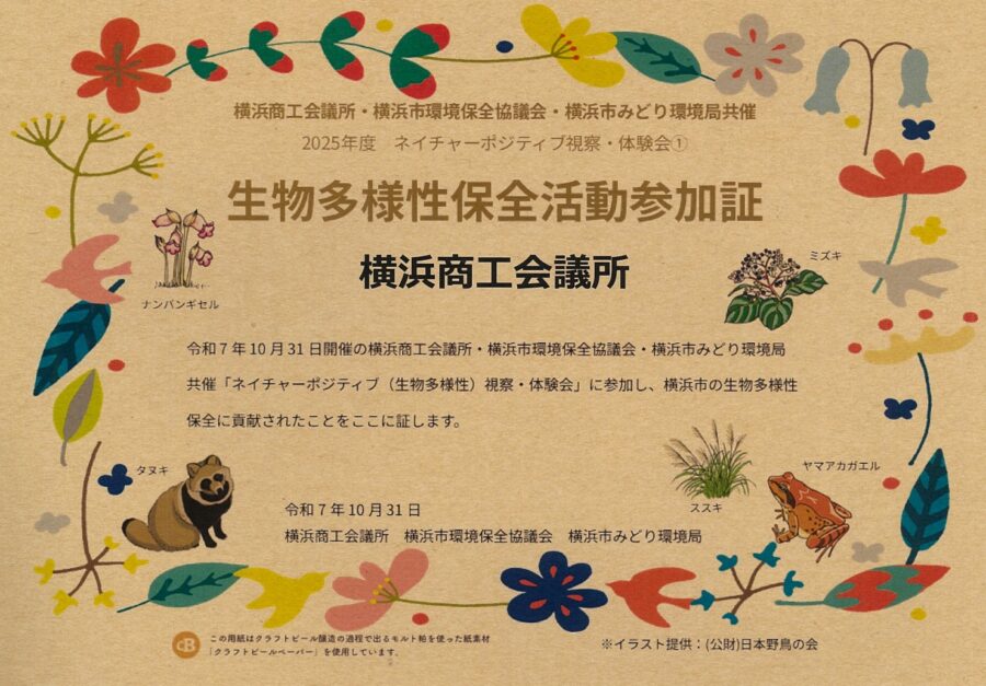 参加者の皆さまには、横浜商工会議所・横浜市環境保全協議会・横浜市みどり環境局名によるオリジナルの「生物多様性保全活動参加証」を贈呈しました。