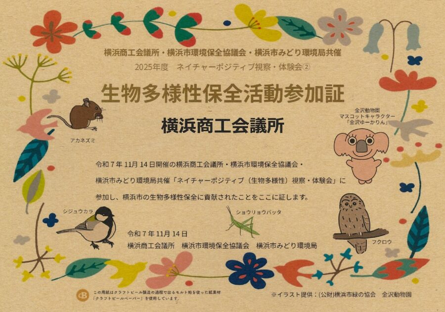 参加者の皆さまには、横浜商工会議所・横浜市環境保全協議会・横浜市みどり環境局名によるオリジナルの「生物多様性保全活動参加証」を贈呈しました。