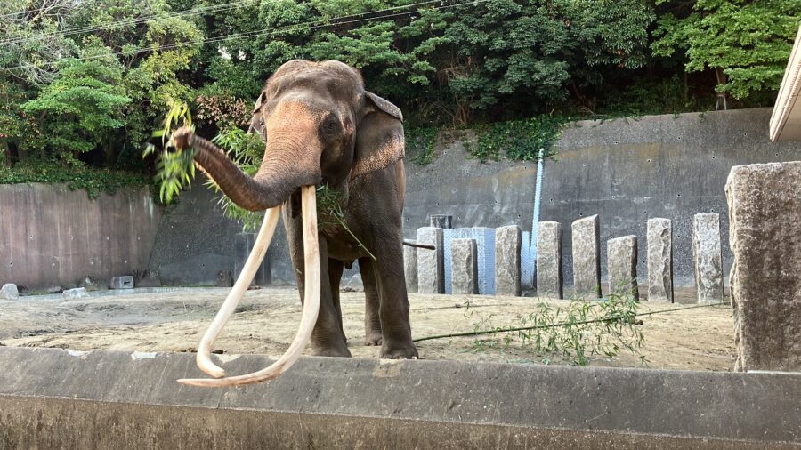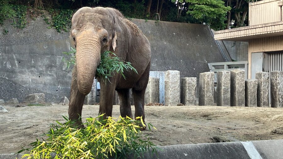 自分たちで切り出したばかりの新鮮な竹を、ゾウたちにプレゼントしました!太い竹を鼻で器用に掴み、割ったり折ったりしながらバキバキと音を立てて食べる姿は圧巻!ゾウにとって、硬い竹を時間をかけて食べることは、退屈な時間を減らし心身の健康増進に効果があるそうです。私たちが森を整備し、その恵みを動物が受け取り、さらにゾウのフンが堆肥となって活用される…そんな素敵な「資源循環」を目の前で実感できました 。
