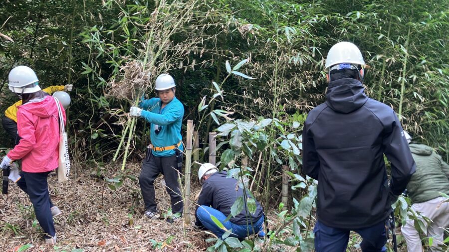 座学の後は、いざ森の中へ!かつての里山は、人の手が入ることで光が差し込み、多様な生物が暮らせる環境が維持されていました。しかし、現在は管理が行き届かず、常緑樹や竹等が密生し、暗い森になってしまっている場所が多くあります。同園では、ネイチャーポジティブ推進の一環として、荒れてしまった里山の再生に取り組んでいます。今回は、その活動をお手伝いさせていただきました。
