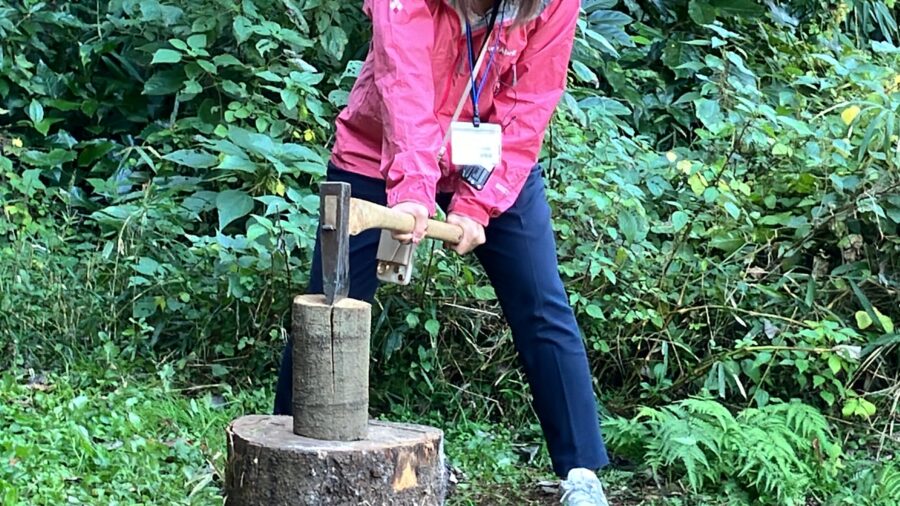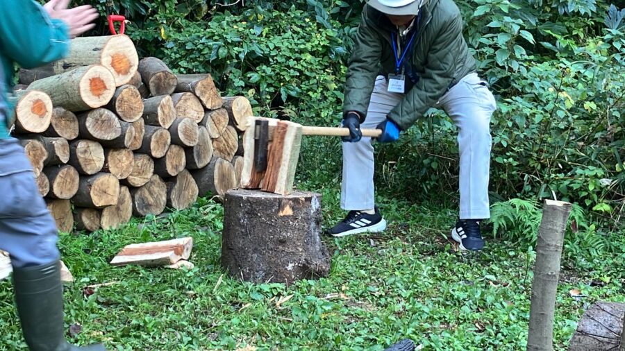 森の手入れで出た木材を、動物たちの暖房や温水の燃料にするための「薪割り」を体験 。 斧を振り下ろし、「パカーン!」と綺麗に割れると、「いい音ですね!」「おぉ~!」と歓声が上がります 。 ストレス発散になりつつ、化石燃料の削減に貢献します 。